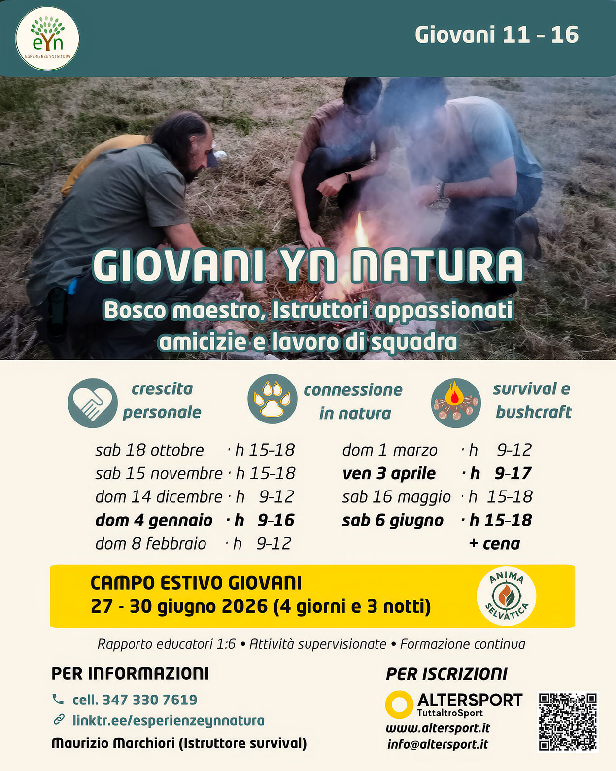 Una intera giornata tra bosco e survival responsabile: orientamento, piccolo riparo, fuoco in sicurezza. Il bosco che insegna, istruttori appassionati, amicizie e lavoro di squadra. Attività sorvegliate e adatte 11–16 anni.