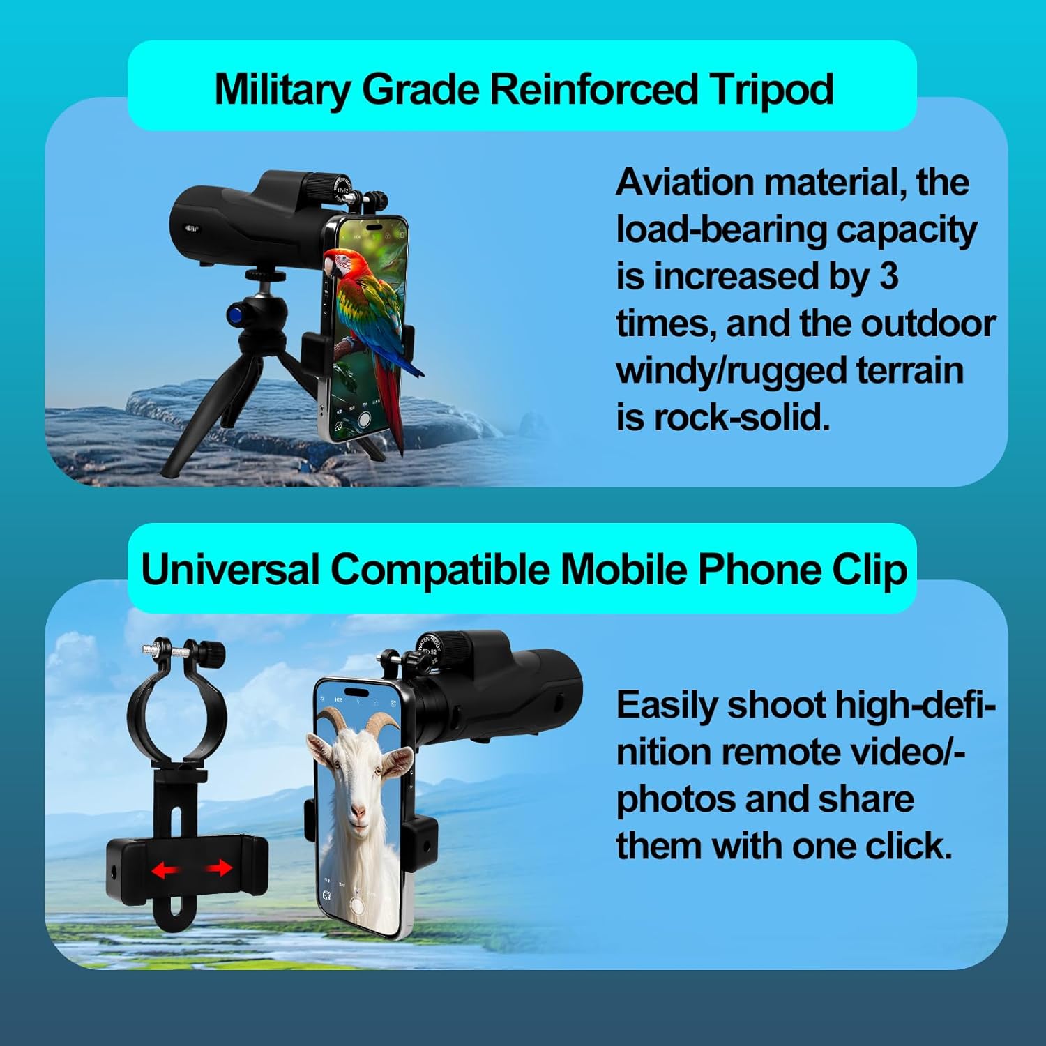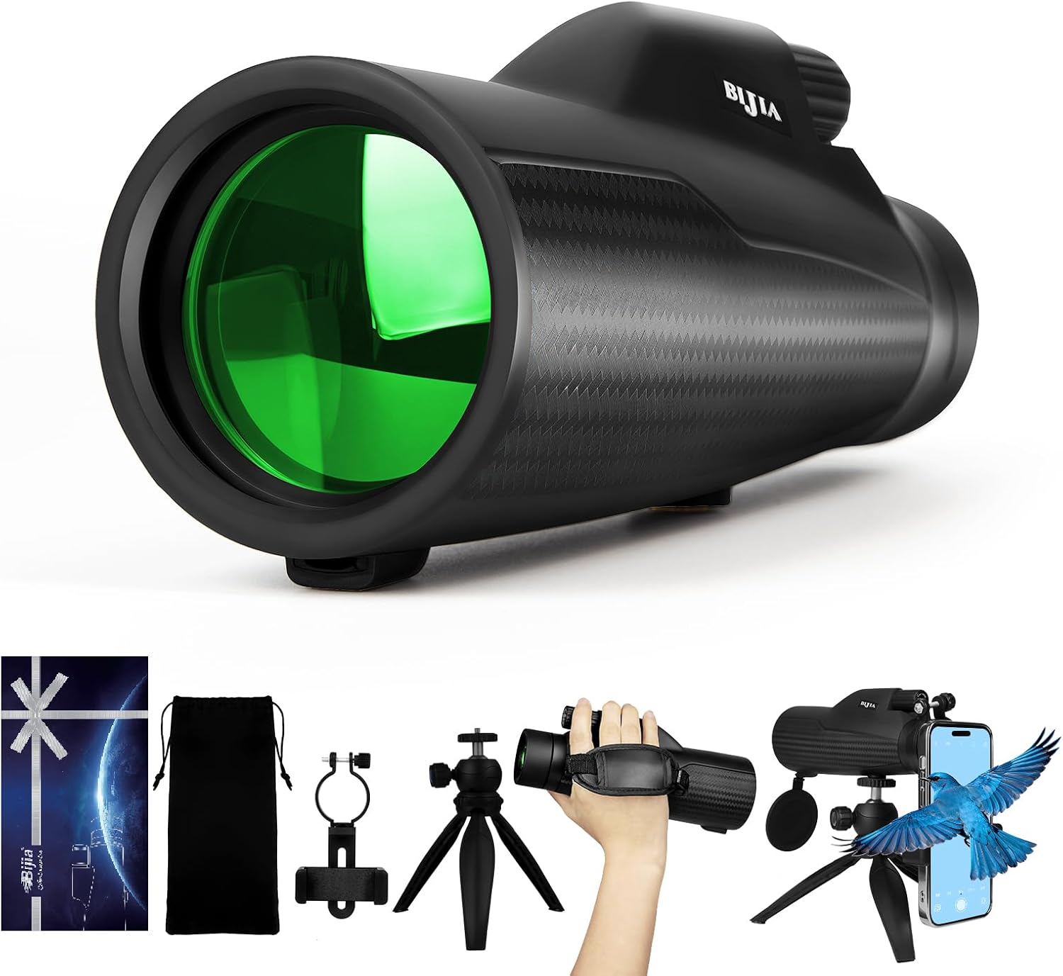 | BuiltIn Media | A 12x52 monocular telescope, a tripod, a phone adapter, a hand strap, a cleaning cloth, a storage bag and a gift box. |