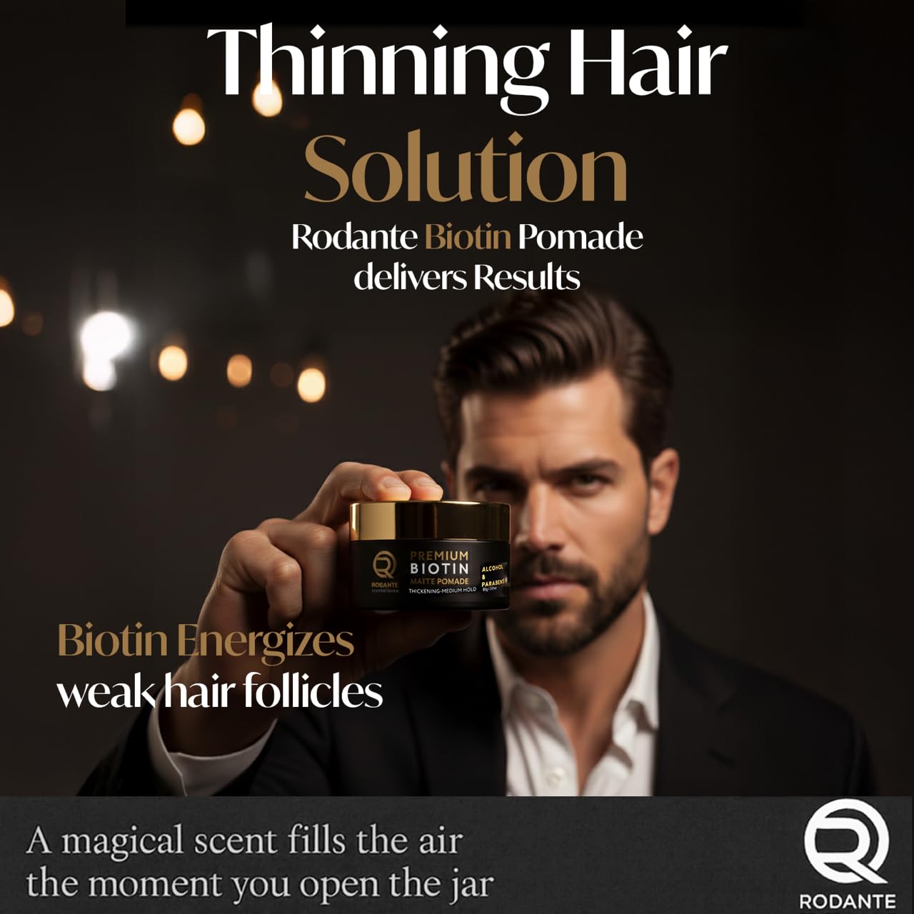 Formulated by premier celebrity hairstylist Rodante Smith, Rodante Biotin Pomade is a premium, matte-finish styling pomade engineered for men experiencing thinning or fine hair. Developed under Rodante Beverly Hills Premium Haircare, this advanced formula not only delivers professional styling performance but also helps reduce hair loss by nourishing the scalp and strengthening follicles. Infused with biotin, castor oil, tea tree oil, shea butter, and vitamin E, it supports healthier hair growth while providing natural texture and everyday styling control. Perfect for men ages 24–54 seeking fuller, thicker, and stronger hair with a clean, non-greasy matte finish that lasts all day. No parabens. No harsh alcohols. No buildup. Just thicker, stronger hair styled to perfection.