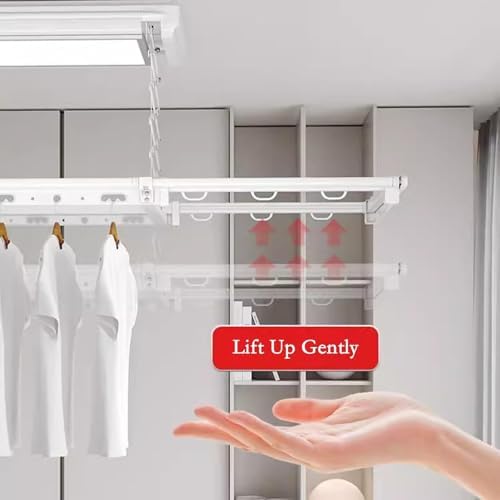 Wall Mount Hanger Holder Closet Organizer Discover the perfect solution for maximizing your storage space with our Wall Mount Hanger Holder Closet Organizer. Whether you're looking to organize your , pantry, closet, laundry, bathroom, office, or beauty care area, we have you covered. **Key Features:** - **Efficient Organization:** Keep your hanging garments neatly organized and wrinkle-free. The Hanger Holder is perfect for shirts, pants, and even damp clothing that needs to air dry. - **Space-Saving Design:** The unique design of the hanger holder allows you to flip the arm up when not in use, minimizing space usage and enhancing your storage options. - **Versatile Utility:** Ideal for small spaces including closets, hallways, and laundry rooms. Use it to hang outfits for the week, seasonal coats, or laundry items. **Easy Installation:** This retractable ceiling drying rack is straightforward to install and requires no complicated tools. Its design and appearance make it an excellent addition to your home. **Specifications:** - **Product Name:** Electric Clothes Hanger / Electrical Drying Rack - **Material:** Aluminum Alloy - **- **Dynamic Load Bearing:** 35kg - **Packaging Includes:** 1 Electric Drying Rack (including all installed accessories) **Important Notices:** 1. Please verify the dimensions prior to purchase. Note that due to manual measurements, an error of 0-3mm may occur. 2. Items other than the drying rack shown in product photos are not included. 3. Slight color variations may exist due to individual monitor settings. 4. The provided data is for reference only; please refer to the actual product for accurate sizing. Transform your space with the Wall Mount Hanger Holder Closet Organizer and experience ultimate convenience in your daily routines.