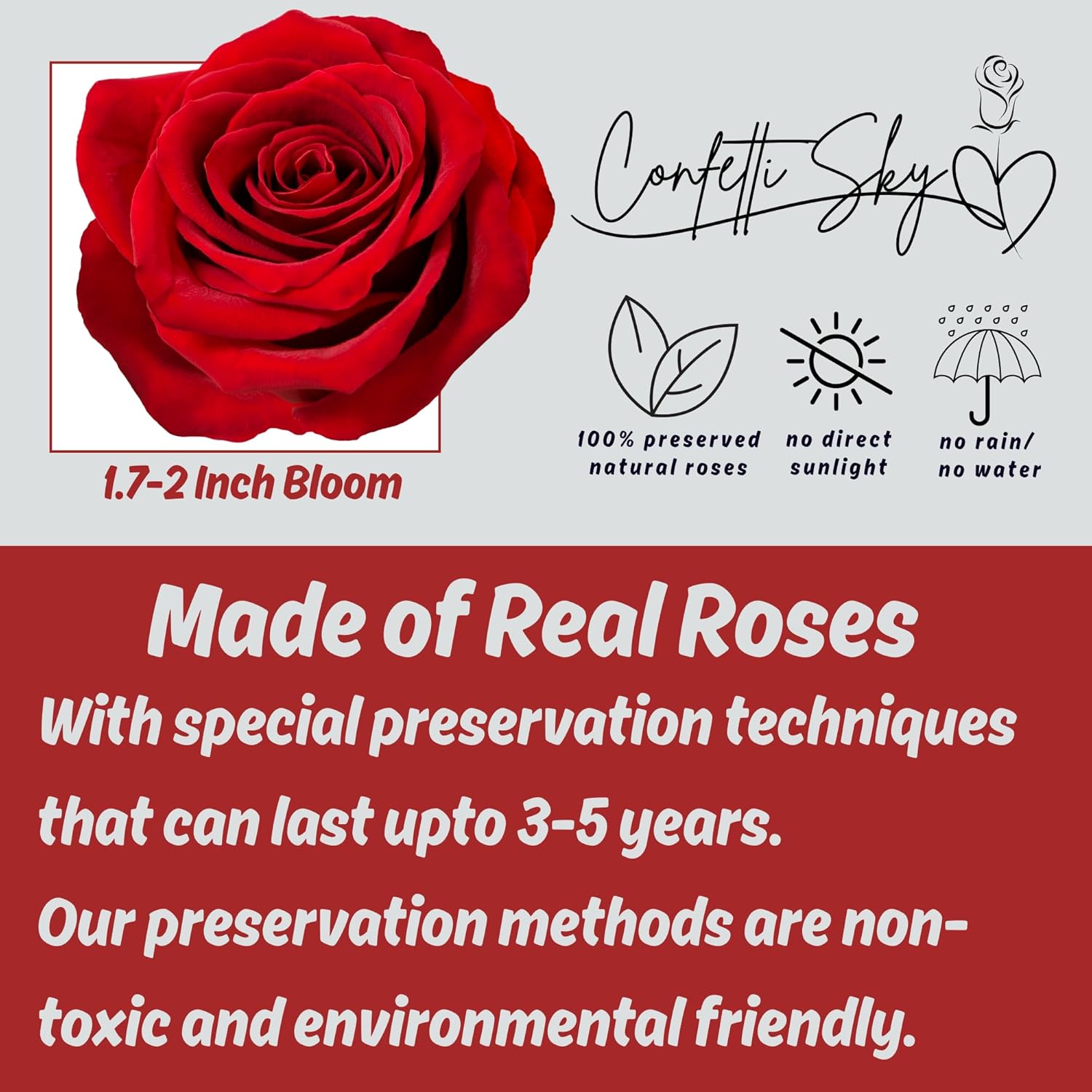 | Style | 6 Pack Confetti Poppers and 16 Preserved Roses |
