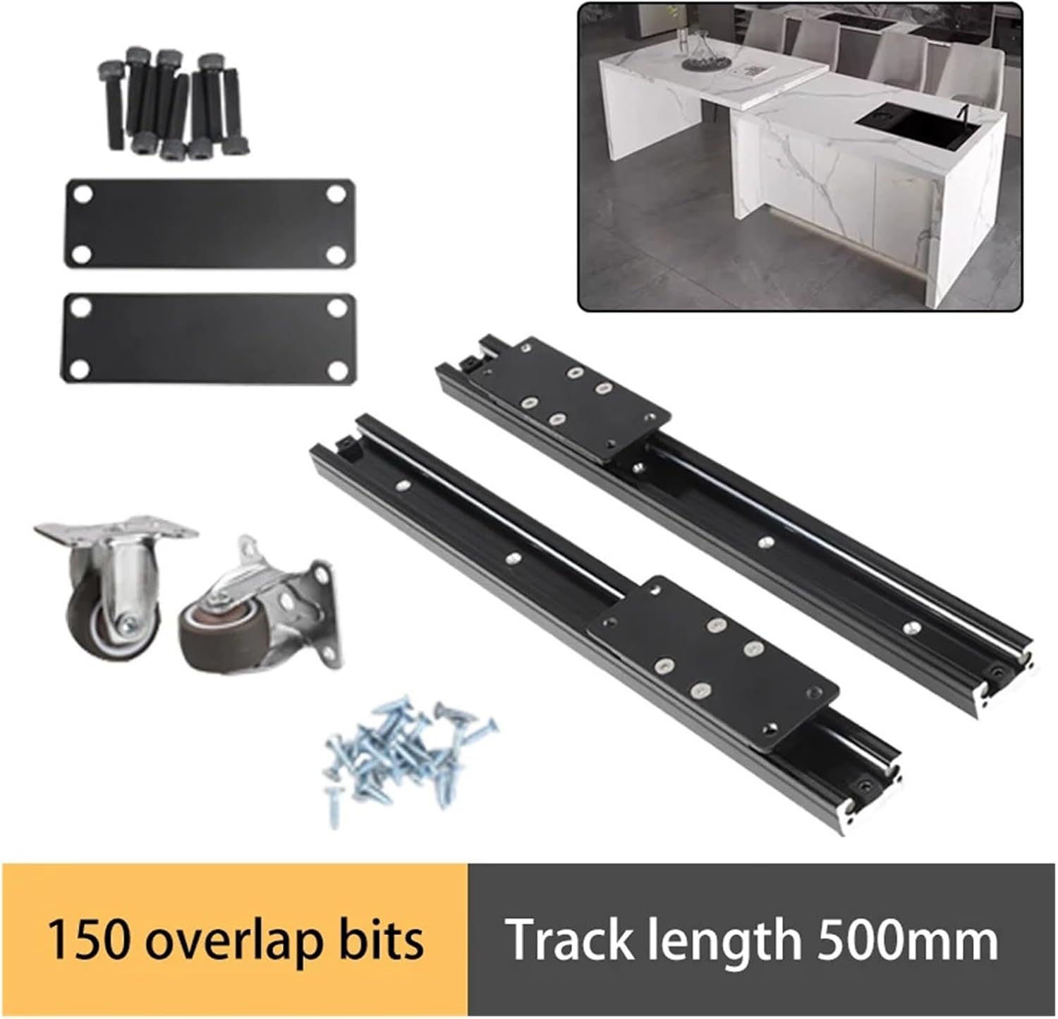 1. Easy to take down and clean,good load-bearing capacity, no shaking, and durable2. Feature a fold full extension design, enabling them to fully open for easy access3. With multiple fixed hole positions for easy installation and adjustmentSpecifications:Product name: Open island slide accessoriesMaterial: Aluminum alloySize: 300-500mmLoad-bearing capacity: 150KGtreatment: Black treatmentScope of application: island, dining table, workbench, etc.Description:Adopt strength aluminum material to form one piece, the thickness is not easy to deform, the load-bearing capacity is strong, the structure is stable, the wheel is silent and does not damage the floor, suitable wooden floors, floor tiles, floors, cement floors and other surfaces, easy to install, the included hardware accessories simplify the installation process, easily add convenience to your space.Packing list:1set open slide accessories