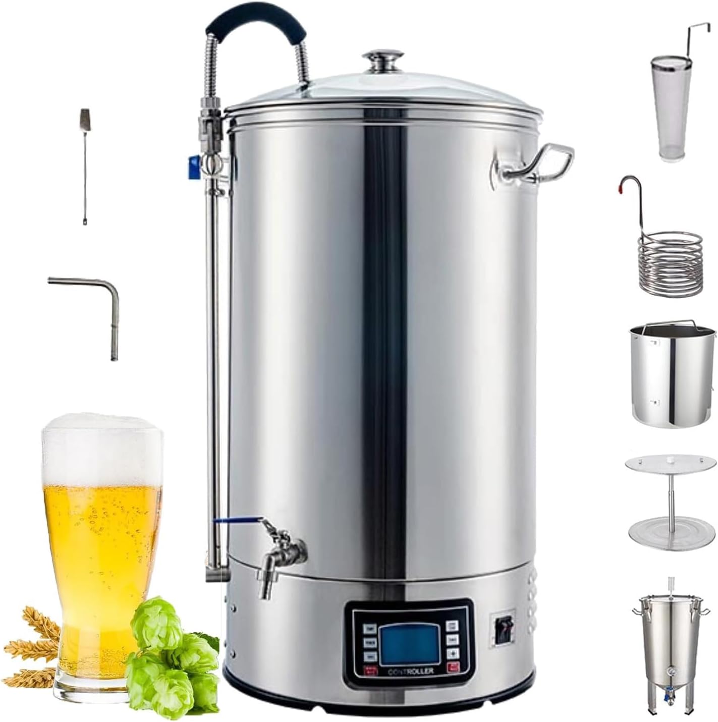 Specifications: Home Electric Brewing Systems Color: Silver Material: Food-grade stainless steel 304 stainless steel Power: 2500W Capacity: 30L/40L Functions: Integrated heating, mashing, filtering, recirculation, settling, and cooling Package Contents: 1* Home Electric Brewing System 1* 8.8m Cooling Tube 1* Filter Screen & Reflux Tube Assembly 1* Malt Mashing & Filtering Bucket 1* Tap Filter Cartridge 1* 20L Open-Top Water Bucket 1* 30L/40L Fermentation Tank 1* Large Filtering Bucket 1* Stirring Rod 1* U-shaped bend pipe