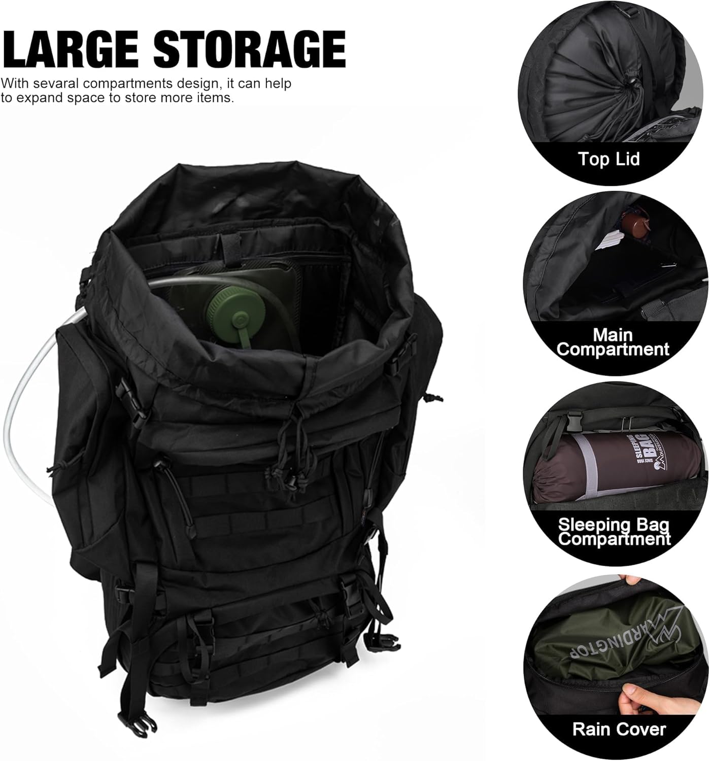 Mardingtop Tactical Backpack Military Backpack Internal Frame Molle Backpack with Rain Cover for Camping Hiking Trekking TravelingProduct Fetures:Modular lightweight load carrying equipment cover all around the pack,you can hang your sleeping bag,sleeping met,hammock,tent or other camping gears.Patch Area for nametape and flag patches .Hiking Pole Attachment can hold hiking poles, ice ax or selfie stick.A zipped pocket on the top of the pack, perfect for your rain cover (included).Hydration System Compatible.The elastic compartment that is also suitable for a 15.6" laptop and big enough for a 2.5 Liters hydration bladder or other items that require quick access. Product Parameters Fabric:600D PolyesterWashing &Maintenance Suggestion 1. 600D polyester fabric. Please do not wash with liquid detergent or bleach. 2. Clean with wet cloth if necessary. 3. Air dry. 4. Please do not iron it. Package 1 X Tactical Backpack