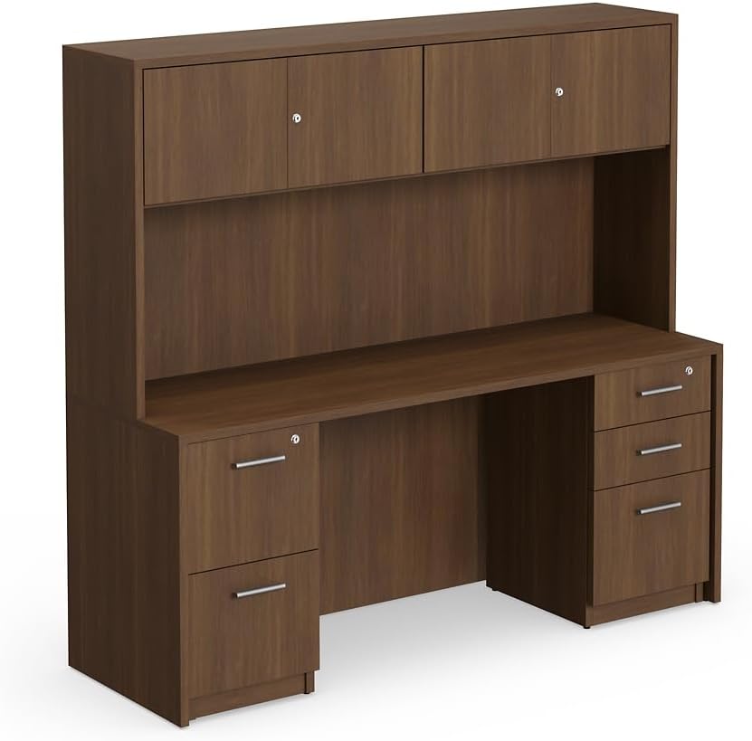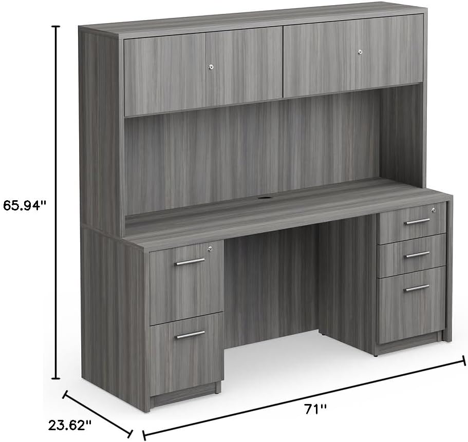 Transform your workspace with the NBF Signature Series At Work Credenza and Hutch Set, a professional-grade storage and workstation solution built for durability, organization, and modern office aesthetics. This set is crafted from scratch- and stain-resistant gray laminate, providing long-lasting resilience against everyday wear while maintaining a polished, executive appearance. The credenza includes two lockable utility drawers and three letter hanging file drawers, allowing you to secure important documents and store office supplies with ease. Paired with a functional hutch featuring four closed cabinets, the set delivers exceptional vertical and horizontal storage capacity ideal for document-heavy or multi-department work environments. Engineered for reliability and smooth operation, each drawer is equipped with 3-quarter adjustable ball-bearing glides capable of supporting up to 100 pounds, ensuring quiet and stable use even when fully loaded. A built-in grommet hole enhances cable management by keeping chargers, wires, and cords organized and out of sight, and allows retrofitting with circular power ports or charging stations—perfect for modern technology-driven workflows. The At Work collection emphasizes clean lines, natural materials, and minimalist design principles, creating an open and inviting workspace that promotes focus and productivity. This credenza and hutch set combines aesthetic appeal with practical storage solutions, making it ideal for executive offices, home workspaces, and professional environments. Partial assembly required—only the pedestals arrive pre-assembled. Assembly assistance available upon request. Features: Durable gray laminate finish Includes lockable utility drawers Three-letter file drawers Four storage cabinets in a hutch Smooth ball-bearing glides Drawers support up to 100 lbs Built-in cable management grommet Modern, sleek office design Scratch- and stain-resistant surface Ideal for professional workspaces