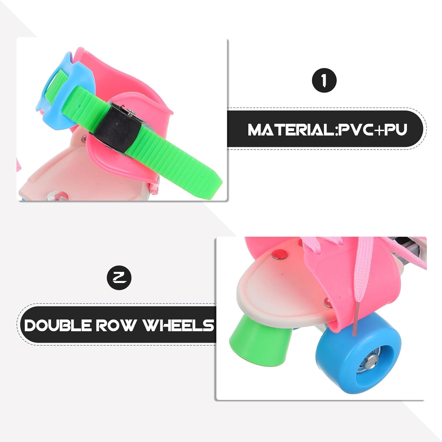 Package List 1 pair Roller Skates Features -Multiscenario use: great for both outdoor roller skating and indoor ice skating, making them highly versatile skate tools -Balanced design: the double row of wheels ensures better balance, making it ideal for young and inexperienced skaters ice skates -Material:PVC+PU rollerskates -Product Info: simple ice skates -Size:18.00X14.50X9.50cm/7.07X5.70X3.73in ice skates -Userfriendly: designed for easy use, these skates allow to start skating with minimal effort quad skates -Growthfriendly: the adjustable feature ensures these quad skates grow with your , providing a great fit every time beginner skates -Color:Multi skates -Enhanced stability: fourwheel construction offers stability, reducing the risk of falls and enhancing confidence roller skates accessoriesGoods Descriptionrecreational skates great for recreational skating, these skates are suitable for use on various surfaces, including sidewalks, driveways, and skating rinks.roller wheels The adjustable sizing feature allows for a fit, ensuring comfort and support.boys roller skates Crafted with durable materials, these quad skates are built to withstand the wear and tear of regular use