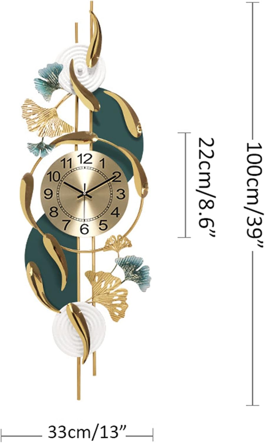 Creative large metal wall clock for homeDECORATIVE FOR YOUR WALLIt is ideal if you have a large wall to fill. Add a beautiful and practical ornament to your home.PRECISE AND SILENTOur silent movement is specially made by the brand's technology, the movement is precise and makes you not miss a beat. Reject annoying ticking! He gives her a peaceful night.THE MODERN CLOCKWall clock is ideal to decorate a living room, bedroom, corridor, restaurant, dining room, kitchen, office, hotel, etc. Suitable for most smooth walls.WALL CLOCK INFORMATION:Size: 100x33cm/39x13"Material:MetalColor:goldQuartz Mechanism:Silent quartz movement,no ticking noiseBattery Powered:Powered by 1 x AA 1.5V battery ( not included )Gift:1 x hook,1 x spare clock handDecorative wall clock for any spaceDecorative wall clocks for living room dining room bedroom kitchen office etc