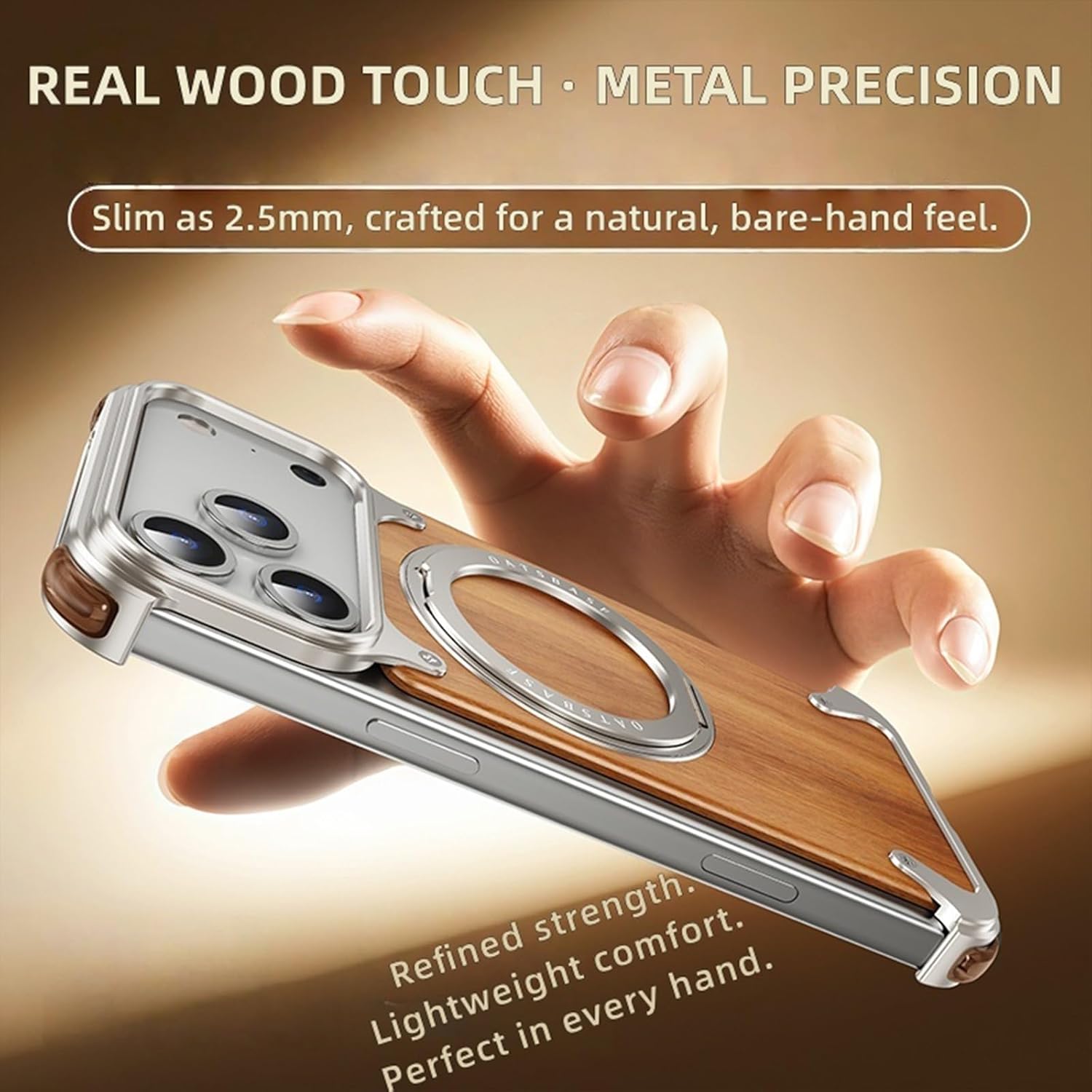 Why Choose UsCombining craftsmanship and innovation, the Wood & Metal Frame Case blends natural texture with modern precision. It delivers minimalist style, reliable protection, and magnetic convenience for everyday refined.【Wood & Metal Frame Case】– Frameless aluminum-alloy structure with open-edge cooling design– Genuine walnut wood panels, each with a distinctive natural pattern– 360° rotating hidden stand for flexible hands-free viewing– Raised metal edges protect the camera and screen from contact– Slim 2.5mm profile for a comfortable, natural grip【Material】Aerospace-grade aluminum alloy + natural walnut wood + soft silicone corner padsKey Highlights– Shock-absorbing corners for dependable impact protection– Magnetic alignment for wireless charging and accessories– Smooth matte surface that resists fingerprints and slips– Lightweight yet rigid structure built for daily protection– Quick, tool-free installation and removal✔ Blending natural beauty and modern engineering for refined protection✔ Package Includes:1 × Wood & Metal Frame Case for iPhone 17 Pro / 17 Pro Max