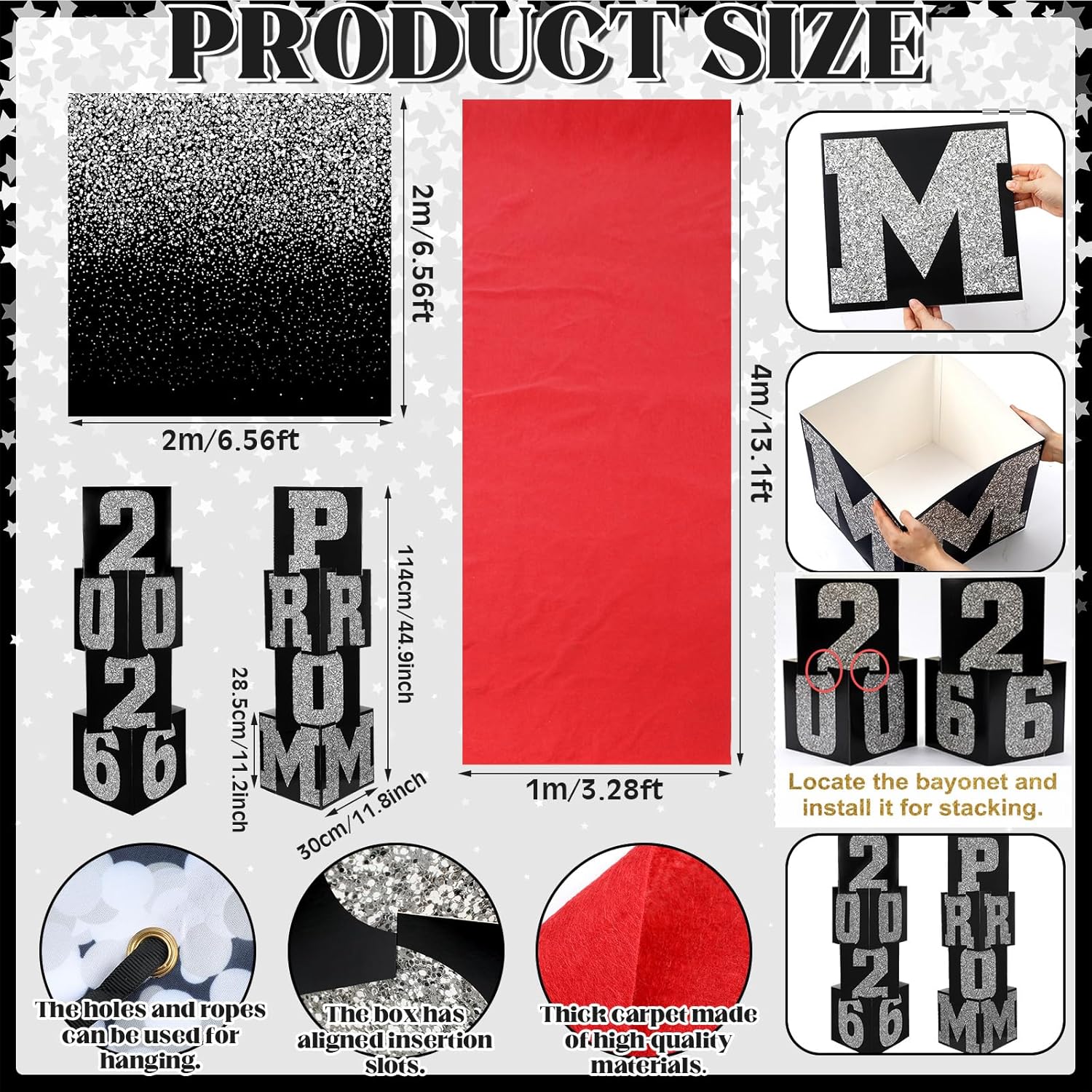 Features: Nice photo props: You and your friend can use the graduation photo booth props as the backdrop to take some cute graduation photos or videos as the memorial. And the delicate prom column will provide you some photo inspiration. The Fun of Assembly: You can complete the prom backdrop 2026 with your friend or classmates together. In the process of completing the prom column, you can experience the fun of decorating the party, and you will close to your friend through this way. Specifications: Material: cardboard Color: gold/silver Size: Size of each box: approx. 11.8 x 11.2 inches/ 30 x 28.5 cm Size of the completed prom column: approx. 11.8 x 44.9 inches/ 30 x 114 cm Size of background banner: approx. 7.87 x 7.87 inches/ 20 x 20 cm Size of red carpet: approx. 2.4 x 15 inches Package includes: 8 x Prom boxes (can create 2 prom columns) 1 x Background banner 1 x Red carpet Notes: Manual measurement, please allow slight errors on size. The color may exist a slight difference due to different screen displays