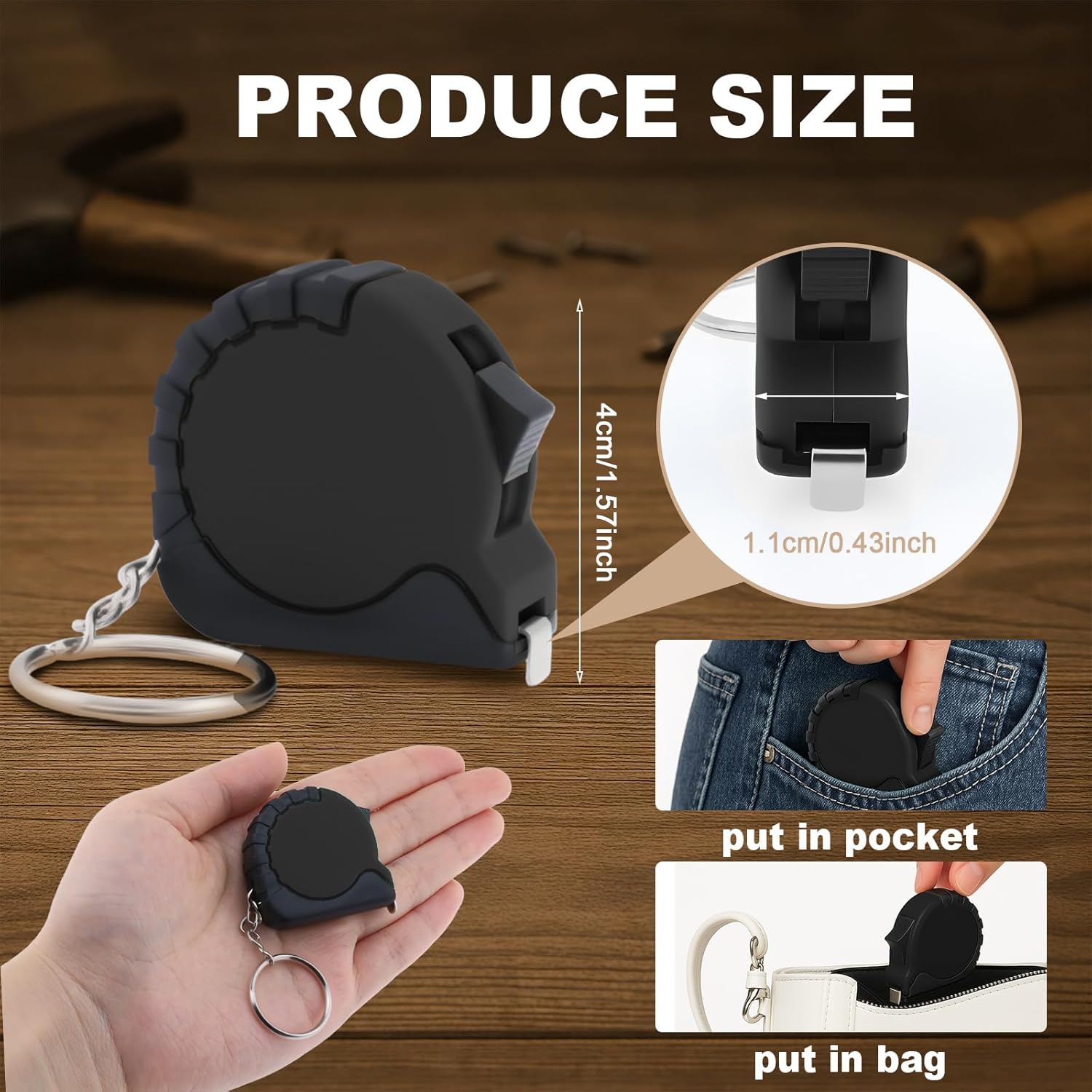 Product Description: Precision Meets Portability This 24-pack of compact mini tape measure tools combines professional functionality with ultimate convenience. Each 3-foot (36-inch/100cm) retractable tape features clear imperial and metric markings, delivering reliable measurements for various tasks while maintaining pocket-sized portability. Engineered for Performance Durable ABS plastic casing resists wear from job site use Stainless steel measurement strip maintains accuracy through repeated use Smooth retraction mechanism with secure thumb-operated lock Integrated keyring for easy attachment to toolkits, belts, or bags Versatile Applications Perfect for: Construction site measurements Crafting and sewing projects Home improvement tasks Classroom STEM activities Trade show promotional items Party favors (construction-themed events, DIY workshops) Bulk Packaging Advantages Receive 24 individually wrapped units ready for: Crew equipment distribution Corporate gifting programs Event goodie bags Retail inventory stocking Workshop participant kits Quality Assurance Each measuring tape undergoes rigorous testing for: Smooth blade extension/retraction Measurement accuracy verification Lock mechanism durability Impact resistance validation Note: All components are generic and functionality-focused. Colors may vary slightly due to screen settings.