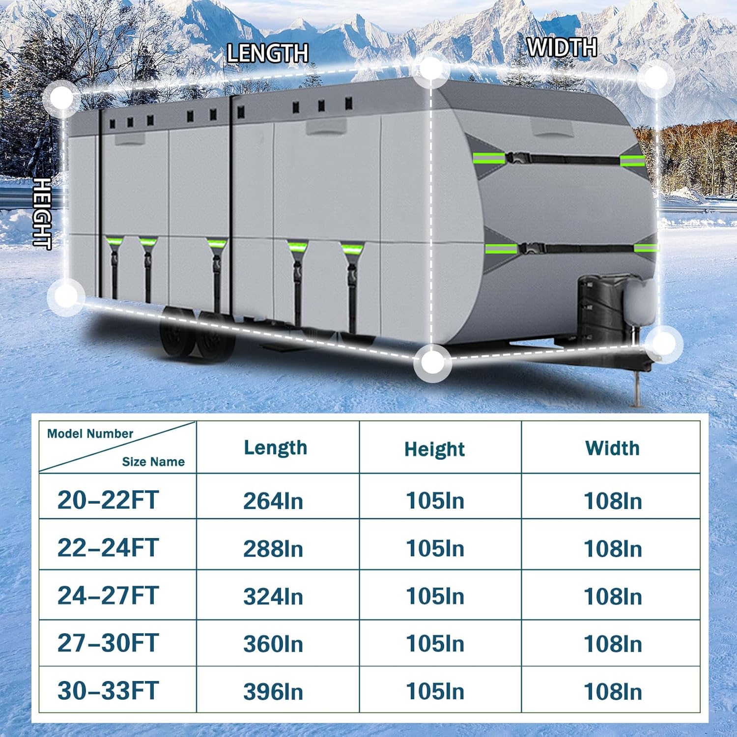 Travel Trailer Cover Size Guide:Fits 20-22FT - 246' L x 108' W x 105' HFits 22-24FT - 288' L x 108' W x 105' HFits 24-27FT - 324' L x 108' W x 105' HFits 27-30FT - 360' L x 108' W x 105' HFits 30-33FT - 396' L x 108' W x 105' HSpecifications:Type:Full Coverage CoverMaterial: Non-Woven FabricCoating: PU CoatingColor: BlackWaterproofness: 8000paFitment Type: Direct ReplacementFeature:Travel Trailer Cover is made up of high quality materials, durable to useEffective protectionEffectively block physical aggressions such as rain, sand and leavesReflective StripReflective strips allow vehicles to be seen at night, reducing the chance of accidentsSoft LiningThe soft inner lining will not scratch the body and can be effectively protectedPerfect for Indoor/Outdoor UseRollable ZipperedEquipped with 3 x rollable zippered door allow access to the RV doors and engine areas anytime, easy to view and check internal situation, it is easy to enter the RV at any time to check the interior condition without removing the whole cover, which greatly improves the convenience of use