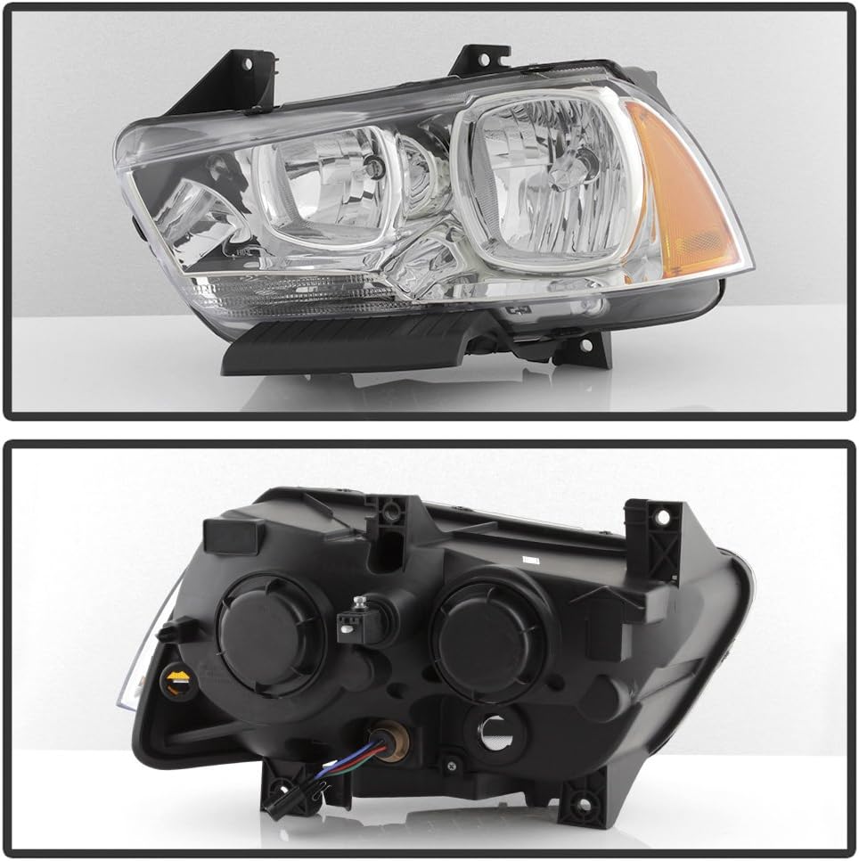 DESIGNED REPLACEMENT FOR2011-2014 Dodge Charger[4-Door Sedan]OEM Equivalent Part Number: 57010410AE, 57010411AE, CH2503232, CH2502232Attention:[Not Compatible on Models w/ Factory HID Headlights]Condition: NewColor: Titanium ClearChrome Housing | Clear Lens Package Include: Driver & Passenger Side (Housing & Lens)PRODUCT FEATURELens:Our Polycarbonate Lens offer superior UV protection and a high impact resistanceStreet Legal Reflector:Highly Reflective Reflectors offer OEM compliances with DOT and SAE standardsThis is a third-party aftermarket replacement part and not a genuine factory component. It is neither manufactured, licensed, nor endorsed by the original vehicle manufacturer. This product is produced by an independent facility and is specifically designed to match the fitment and function of the factory-original item