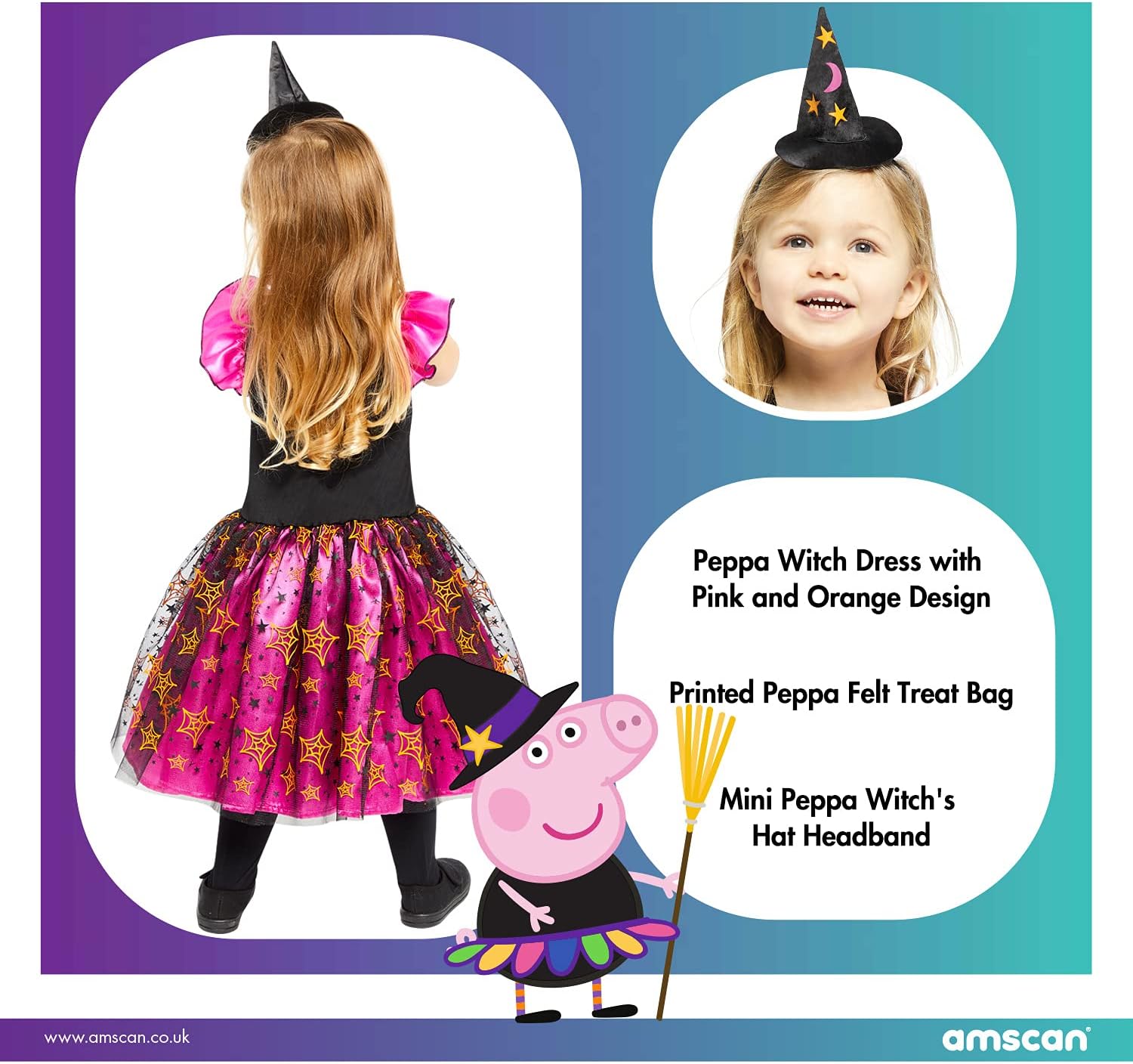 Looking for a costume for your daughter? Then Amscan Peppa Pig Witch Costume is just what you're looking for. Comes with a dress, bag and a witch hat that is attached to the hair band. The multi-piece costume set is available in different sizes. With this Peppa Pig Costume, your daughter will turn into a little witch in an instant. Perfect for Halloween. Other beautiful costumes and party accessories can be found in our brand store. To do this, click on the brand name amscan below the product title.