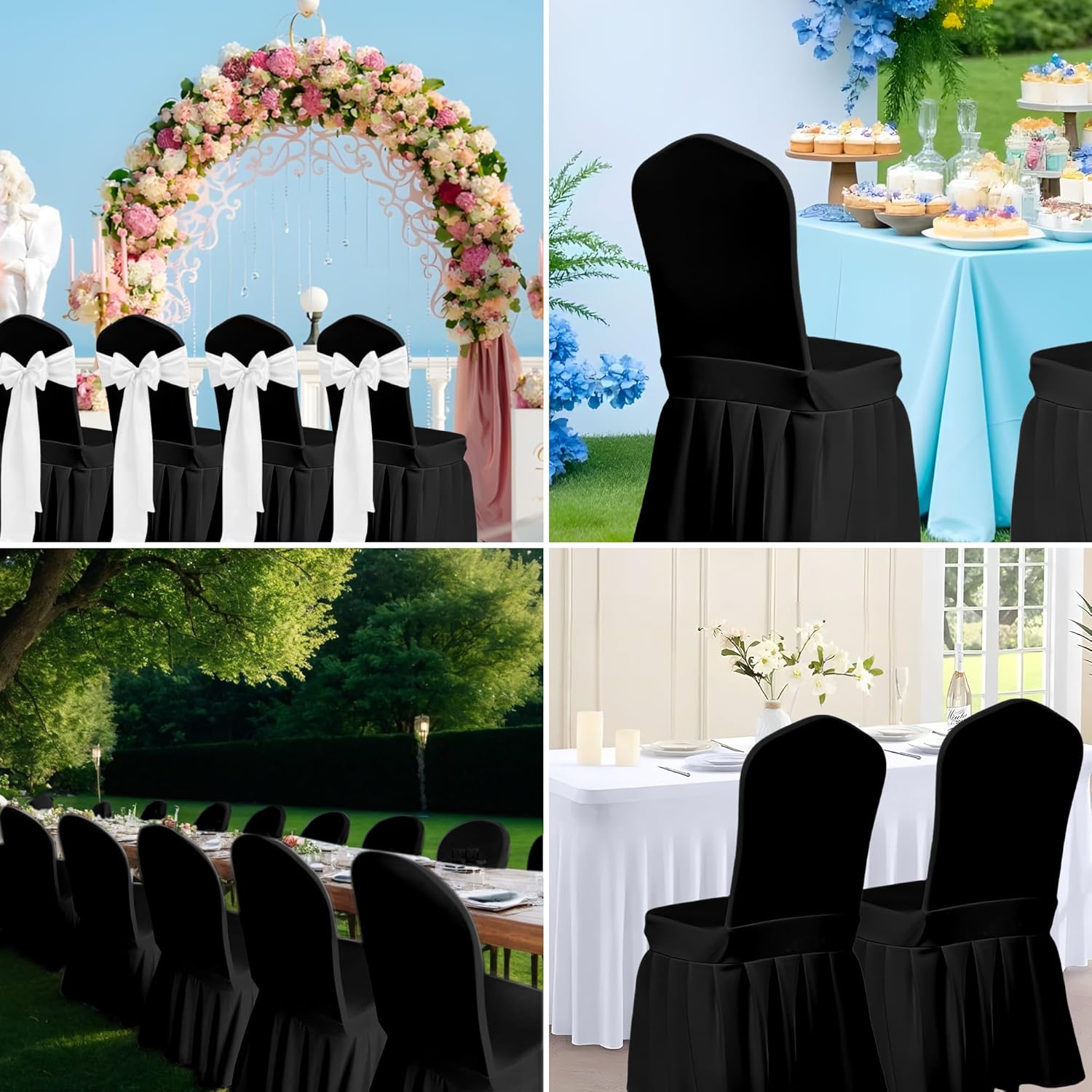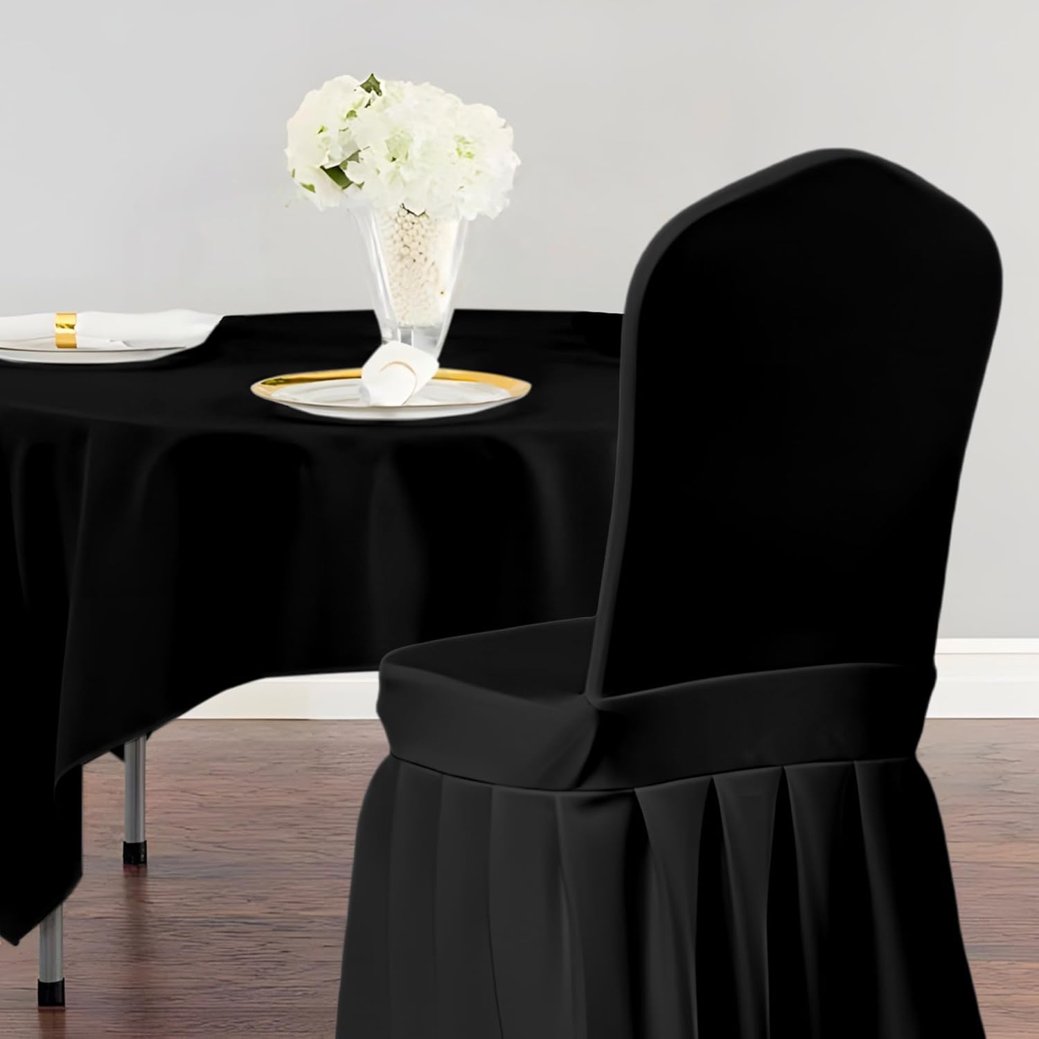 Black Chair Covers 36pcs & Black Chair Covers with Skirt 2pcs for Dining Room, Party, Wedding, Holidays, Banquet, Celebration