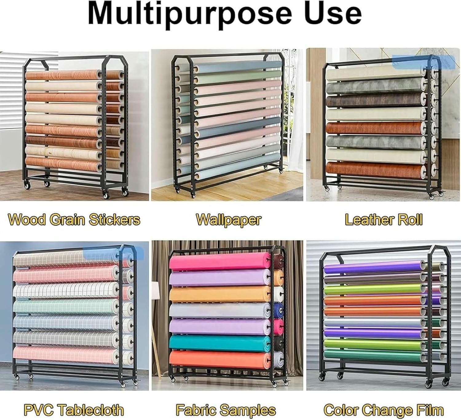 Heavy-duty wall-mounted storage rack system designed for organizing and storing vinyl films and fabric rolls. This versatile rack is also a great solution for organizing your belongings, providing you th an efficient organization and storage system. Experience the convenience and efficiency of our heavy-duty wall-mounted storage rack system. Organize your vinyl packaging, fabric rolls, and crafting accessories to easily create a neat and productive workspace.Product Features:- Easy to clean : pe th wet cloth to remove dirt.- Detachable hanging rod makes it easy to hang and use items.- Adjustable design makes it easy to adjust the distance to suit the storage of items.- It occupies little space while maximum the convenience in household organization.- The 360° rotatable wheels can be moved anywhere, making it easy to reset the space while making cleaning and hygiene simple.Product Name: storage RackProduct material: Metal FrameColor: BlackWhether to assemble: yesFeatures: Snap-on design, the spacing can be adjusted.Furniture structure: bracket structure.Scope of application: shopping malls, supermarkets, warehouses, garages, car beauty shops,Package Includes: Scarves Holder x 1
