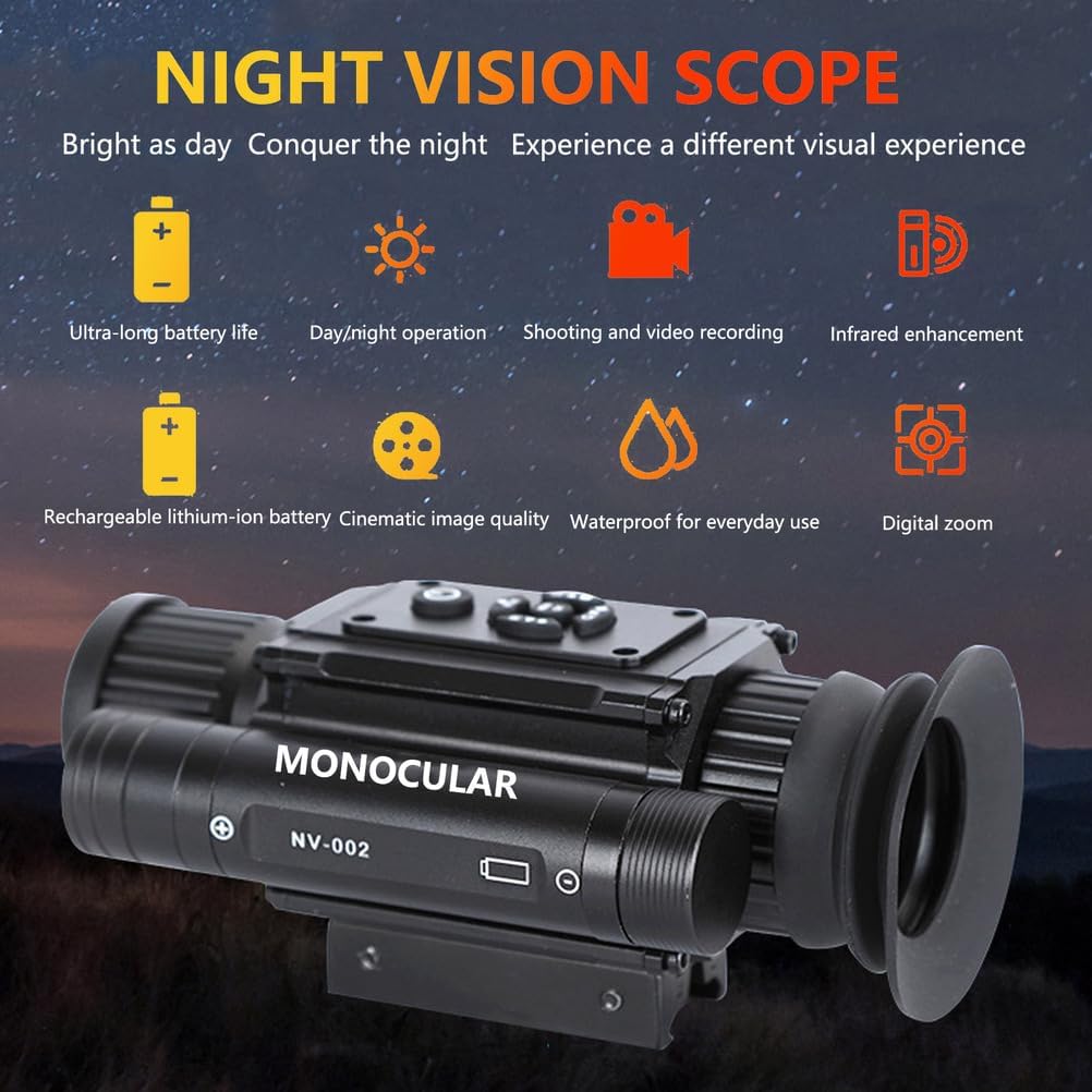 ★ Features:This telescope includes high-definition night vision capabilities. It can be used both day and night, and comes with a built-in 11/20mm universal mount for direct mounting on a variety of equipment. Even in pitch-black darkness, you can clearly see your target. It also features high-definition photography, video, and audio recording. It combines night vision, a sight, a telescope, and a camera—all in one.★ SpecificationProduct Name: Night vision MonocularModel: NV-002Magnification: 4XPhoto Resolution: 3072x1728Video Resolution: 1920x1080Display Resolution: 454x454Video Format:MP4Frame Rate: 30fpsInfrared Wavelength: 850nmInfrared Range: 200mStorage Type: TF card (up to 128G)Main Body Weight: 285gMain Body Size: 120x50x98mmBattery: 18650 Voltage: 3.7vInfrared Power: 3WTransmission Mode:TF card, TYPE-C cable★ Packaging contentNight Vision Scope*1Battery*1Hex wrench*1Instruction manual*1