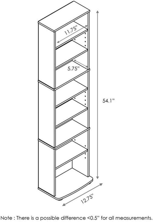 Adorn your living room space or your home theater room with Pemberly Row Space Saving Multimedia Storage Tower. The tower provides organized storage options for safely storing all your multimedia such as CDs and DVDs at the same place and organizing them accordingly for convenient access. 7-Shelf heights are adjustable to create your own storage and display spaces for different sizes items. Easy assembly, lightweight, yet looks refreshing and space saving. A must-have for movie and music buffs, this multimedia storage tower keeps all the essentials right by your flat-screen. Care instructions: Wipe clean with clean damped cloth. Avoid using harsh chemicals. Pictures are for illustration purpose.Features :- Material: Particle board, engineered wood, metal- Finish: Espresso- Simply stylish design yet functional and suitable for any room that need additional storage space.- Adjustable shelves provide easy storage and display for decorative and home living accessories.- Easy home assembly with instructional manual included.Specifications :- Product Dimensions : 54.1"H x 12.75"W x 5.75"D- Product Weight : 17.55 lbs